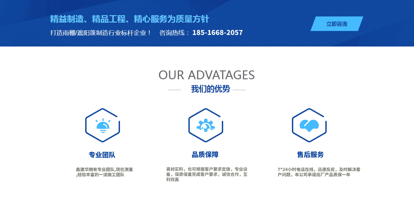 About us鑫建華雨棚有限公司成立于2012年,公司全體勵精圖治,飛速發展,已從初創業公司發展成為多元化公司,目前公司員工約1000余人,其中擁有中、高級專業技術人員100余人,形成以戶外制造產業為主,其他第三產業為輔的多元式經營模式,旗下設有鋼結構公司,環保設備公司.其鋼結構公司主要以研發,設計、生產、營銷、安裝、服務為一體的鋼結構生產制造型企業,環保設備公司主要以“綠色環保節能“為核心戰略品牌.公司相關資質齊備,主營業務:定制各種推拉蓬、活動雨棚、倉庫雨棚、智能電動蓬、伸縮電動噴漆房、懸空電動雨棚等手動,遙控電動一體,系列產品,公司總部位于中國.江蘇,目前,公司年經營規模達8千萬以上,經營區減已輻射全國大部份省會城市,在雨棚領域展露崢嶸,“鑫建華品牌“已成為國內雨棚,在全國市場的占有率及品牌均名列前茅. 公司在蘇州、天津、重慶、武漢、濟南、鄭州、江門、衡陽均設有工廠,覆蓋全國主要城市、八倉生產制作安裝售后、國內訂單全國范圍可上門安裝服務、國外訂單可派工程師出國指導安裝....